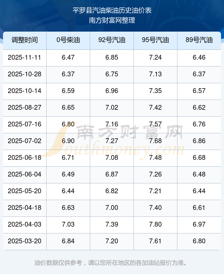 平罗县汽油、柴油11月20日每升的价格具体是(11月11日调整后的价格):92号汽油6.85元;95号汽油7.24元;89号汽油6.46元;0号柴油6.47元。