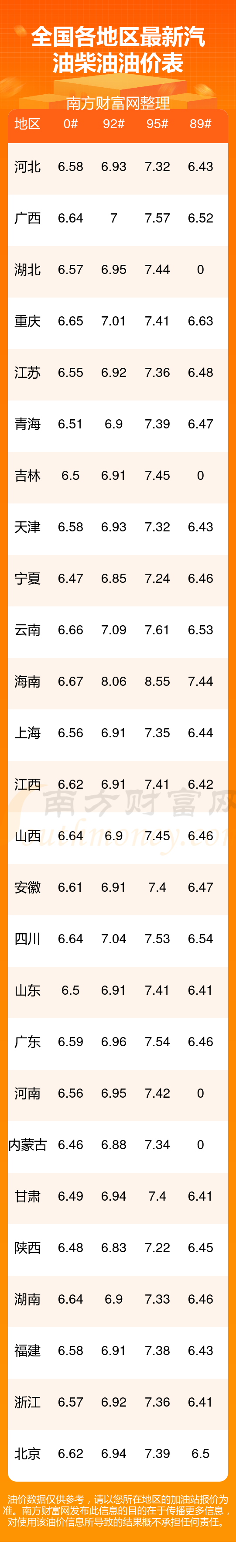 以上数据仅供参考,请以您所在地区的加油站实际售价为准。开云手机web版登录入口发布此信息的目的在于传播更多信息,对使用该油价信息所导致的结果概不承担责任。