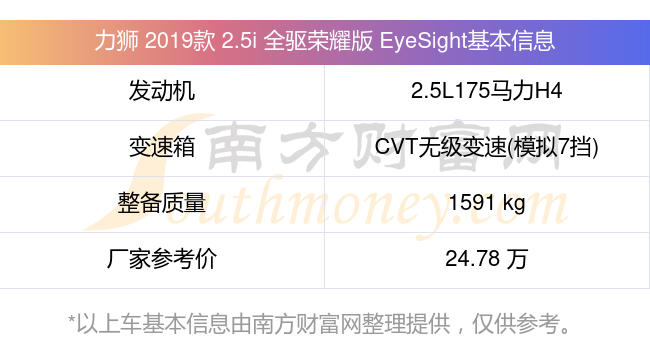 力狮 2019款 2.5i 全驱荣??版 EyeSight搭载了一台2.5L175马力H4自然吸气发动机,采用CVT无级变速(模拟7挡)自动档变速箱,常规整备质量1591kg,厂家参考价24.78万元。