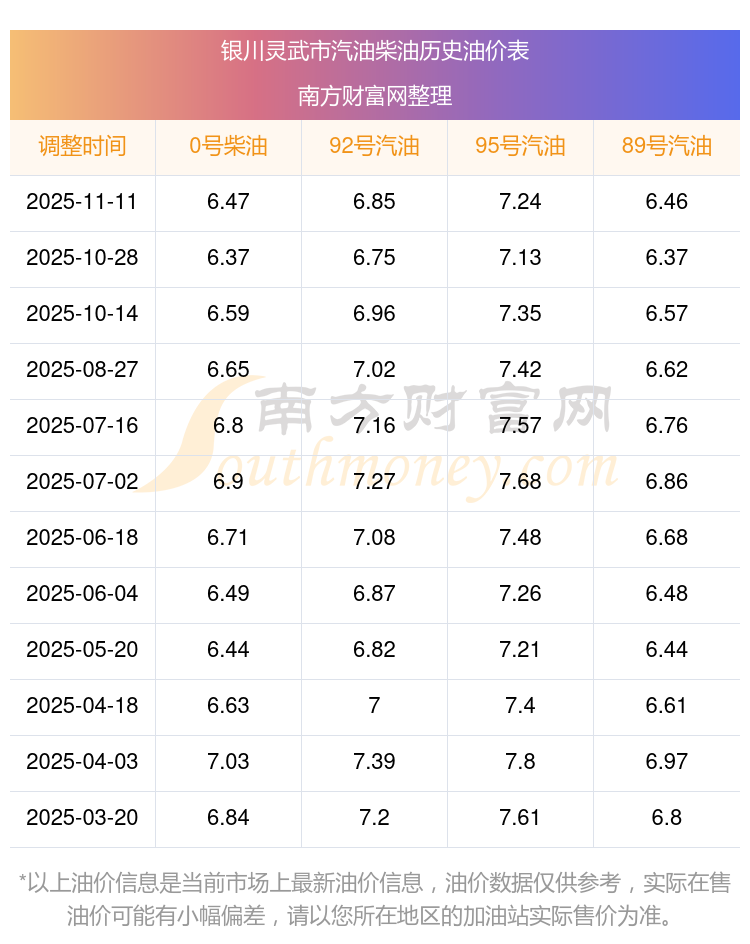 11月20日银川灵武市汽油、柴油每升的价格详情如下:92号汽油6.85元,上涨了0.1元;95号汽油7.24元,上涨了0.11元;89号汽油6.46元,上涨了0.09元;0号柴油6.47元,上涨了0.1元,本次油价的调整时间为11月11日。