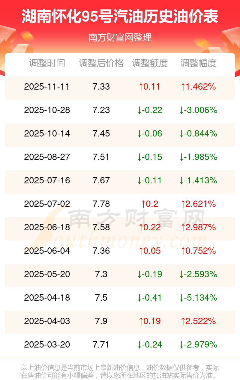 11月20日,湖南??化95号汽油最新价格为:7.33元每升,调整时间为11月11日,相对上次调整时间10月28日的油价7.23元每升,升了0.11元,升幅达1.462%。下一轮油价调整时间11月24日24时,距离现在还有4.37天。