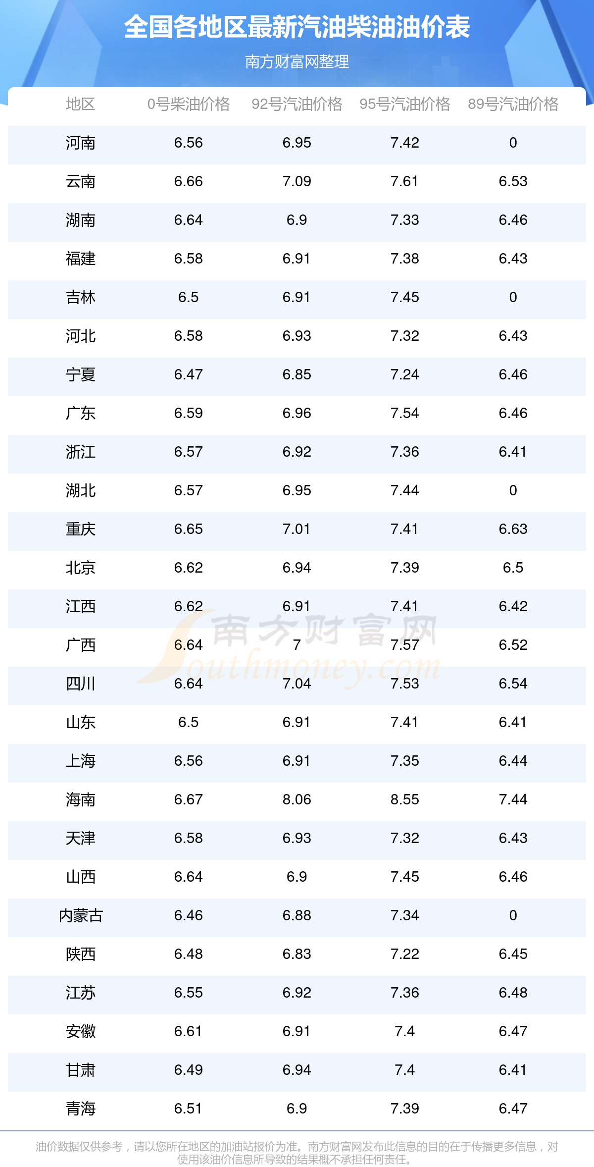 以上油价信息是当前市场上最新油价信息,油价数据仅供参考,实际在售油价可能有小幅偏差,请以您所在地区的加油站实际售价为准。