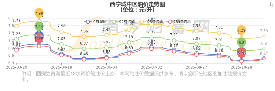西宁城中区汽油、柴油11月20日每升最新价格:92号汽油为6.9元;95号汽油为7.39元;89号汽油为6.47元;0号柴油为6.51元,本轮油价调整时间为11月11日。