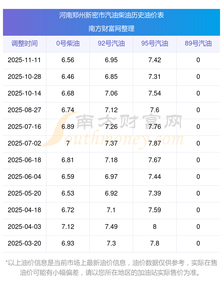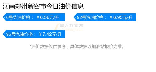 11月20日,河南郑州新密市汽油、柴油每升最新价格:本轮的油价调整时间是11月11日,92号汽油为6.95元,上升了0.1元,上升幅达1.46%;95号汽油为7.42元,上升了0.11元,上升幅达1.51%;0号柴油为6.56元,上升了0.1元,上升幅达1.55%。