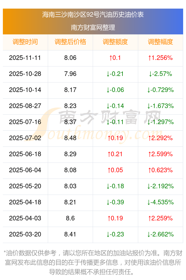 11月20日海南三沙南沙区92号汽油的价格为8.06元/升,本轮油价的调整时间为11月11日,相对上一轮油价调整时间10月28日的价格7.96元/升,上涨了0.1元,上涨幅达1.256%。