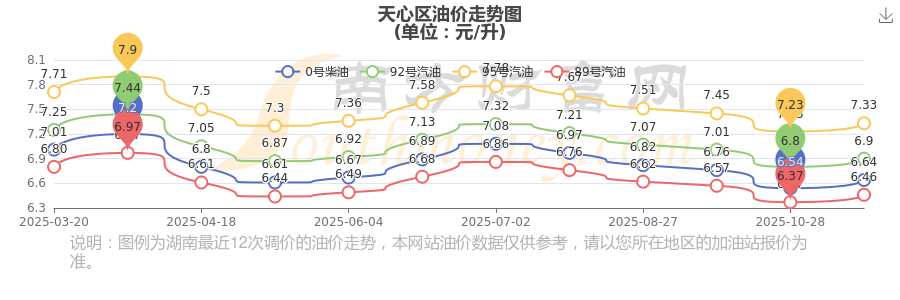 11月20日,天心区汽油、柴油每升的价格是多少?本次油价调整时间是11月11日,92号汽油为6.9元,升了0.1元,升幅达1.46%;95号汽油为7.33元,升了0.11元,升幅达1.46%;89号汽油为6.46元,升了0.09元,升幅达1.46%;0号柴油为6.64元,升了0.1元,升幅达1.58%。