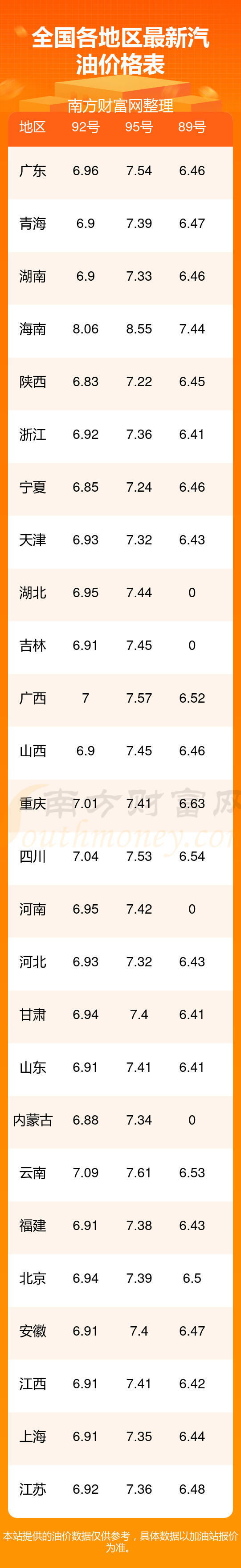 2025年11月20日全国油价调整及最新汽油价格表