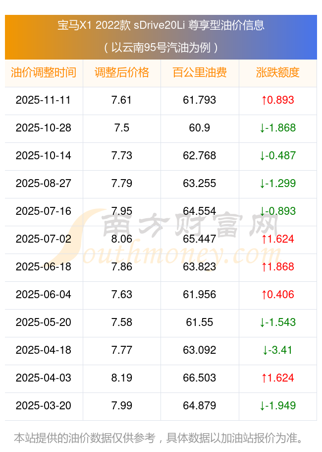 依照11月11日95号汽油最新调整价格7.61元/升来计算(以云南为例),该车型百公里的平均油费是61.793元,依照上一轮10月28日调整价格7.5元/升来计算,百公里的平均油费是60.9元,对比上一轮多花0.893元,下一轮的油价调整时间11月24日24时。