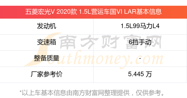 五菱宏光V 2020款 1.5L营运车国VI LAR动力方面,搭载的是一台1.5L99马力L4自然吸气发动机,匹配6挡手动挡变速箱,燃料形式为汽油,厂家参考价5.445万元。