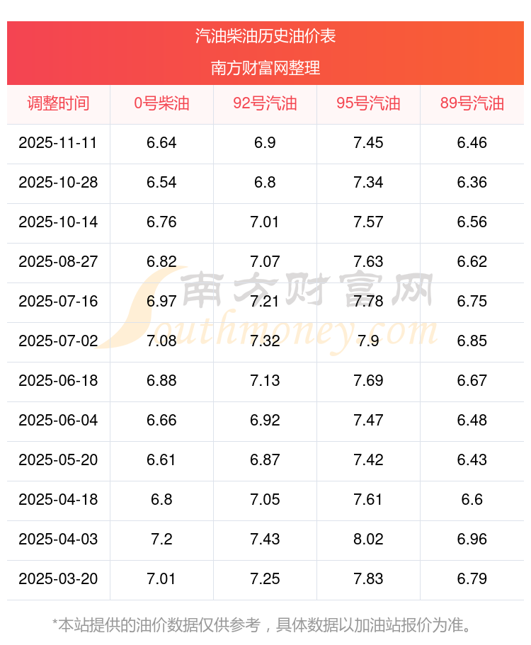 11月20日山西吕梁95号汽油的价格为11月11日调整后的价格,具体为:7.45元每升,相对上次调整时间10月28日的油价7.34元每升,上调了0.11元,上调幅达1.499%。下一轮油价调整时间11月24日24时,距离现在还有4.35天。
