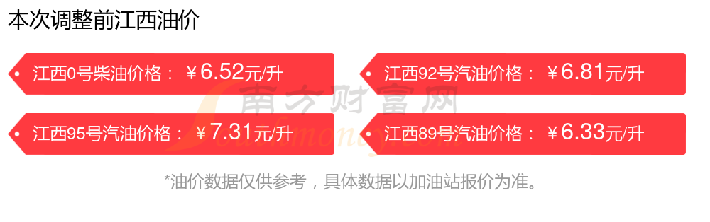 11月21日江西汽油、柴油每升的价格为11月11日调整后的价格,92号汽油为6.91元,上涨了0.1元,上涨幅达1.47%;95号汽油为7.41元,上涨了0.1元,上涨幅达1.37%;89号汽油为6.42元,上涨了0.09元,上涨幅达1.42%;0号柴油为6.62元,上涨了0.1元,上涨幅达1.53%。