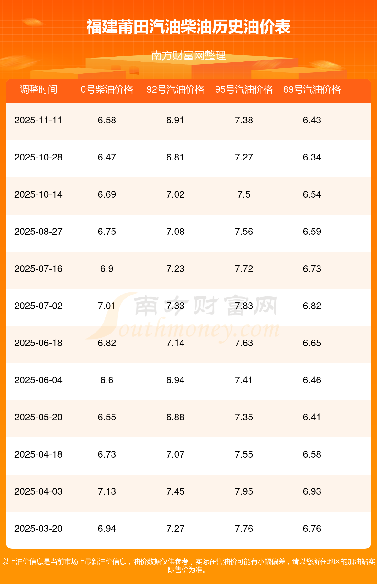 福建莆田汽油、柴油11月21日每升的价格为(本轮油价调整时间为11月11日):92号汽油6.91元;95号汽油7.38元;89号汽油6.43元;0号柴油6.58元。