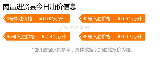 11月21日,南昌进贤县汽油、柴油每升最新价格:调整时间为11月11日,92号汽油为6.91元,上升了0.1元,上升幅达1.47%;95号汽油为7.41元,上升了0.1元,上升幅达1.37%;89号汽油为6.42元,上升了0.09元,上升幅达1.42%;0号柴油为6.62元,上升了0.1元,上升幅达1.53%。
