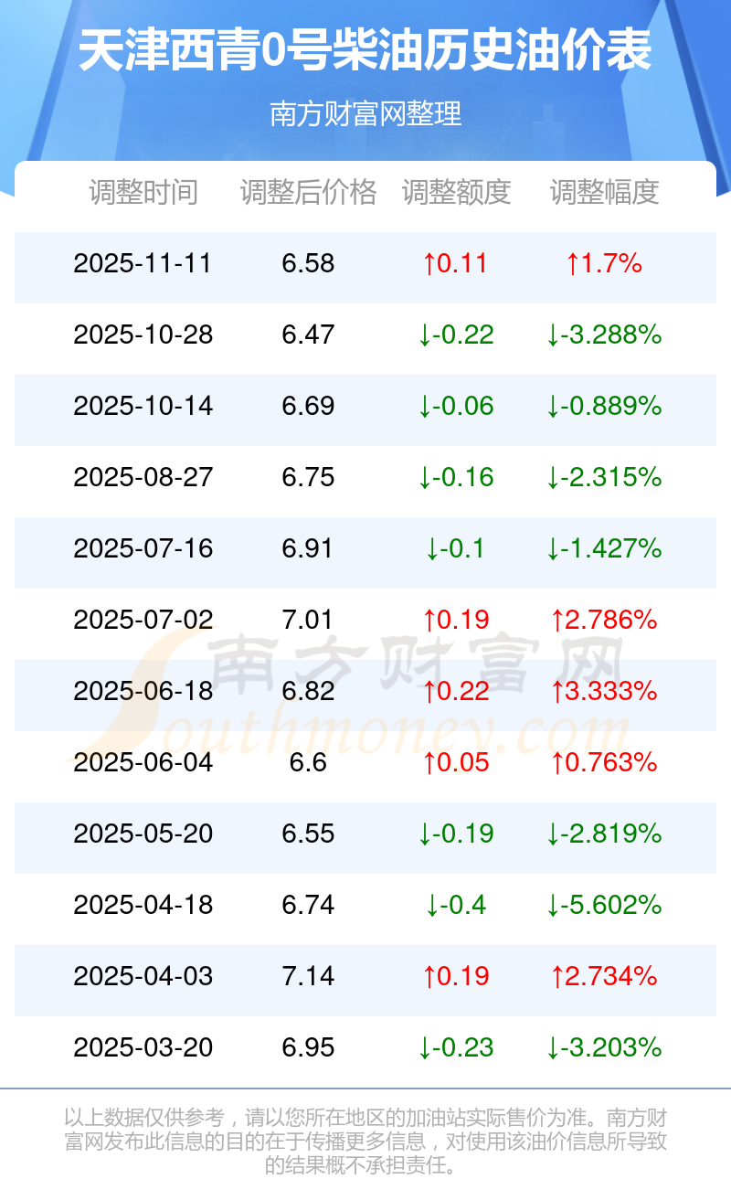 天津西青0号柴油11月21日最新价格为11月11日油价调整后的价格,具体为6.58元/升,相对上次调整时间10月28日的油价6.47元每升,共涨了0.11元,涨1.7%。