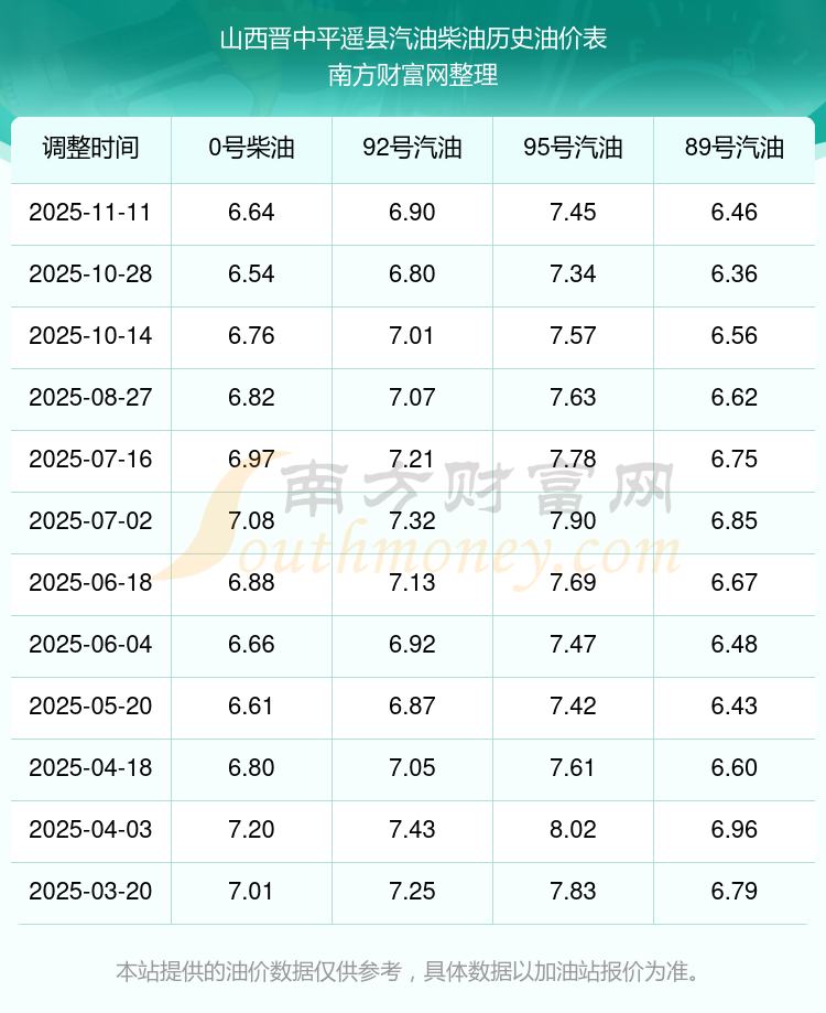 油价调整最新消息:下一轮油价调整时间11月24日24时。11月21日,山西晋中平遥县汽油、柴油每升最新价格为:92号汽油为6.9元,上升了0.1元;95号汽油为7.45元,上升了0.11元;89号汽油为6.46元,上升了0.1元;0号柴油为6.64元,上升了0.1元,调整时间为11月11日。