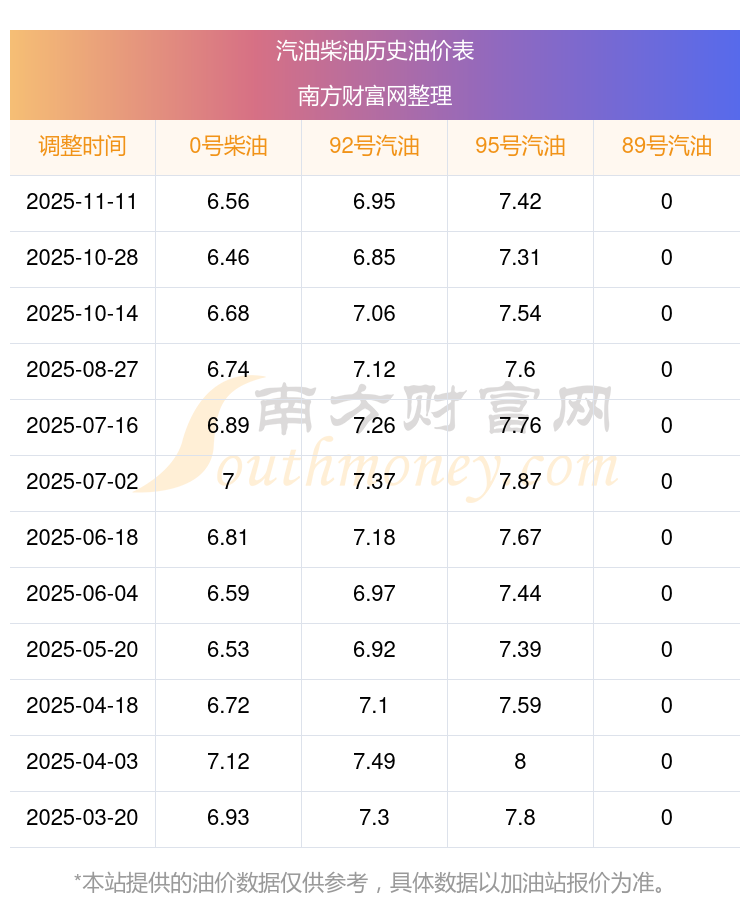 11月21日,许昌92号汽油价格为每升6.95元,这是11月11日油价调整后的价格,相对上次调整时间10月28日的油价6.85元每升,增了0.1元,增1.46%。下一轮油价调整时间11月24日24时,距离现在还有3.61天。
