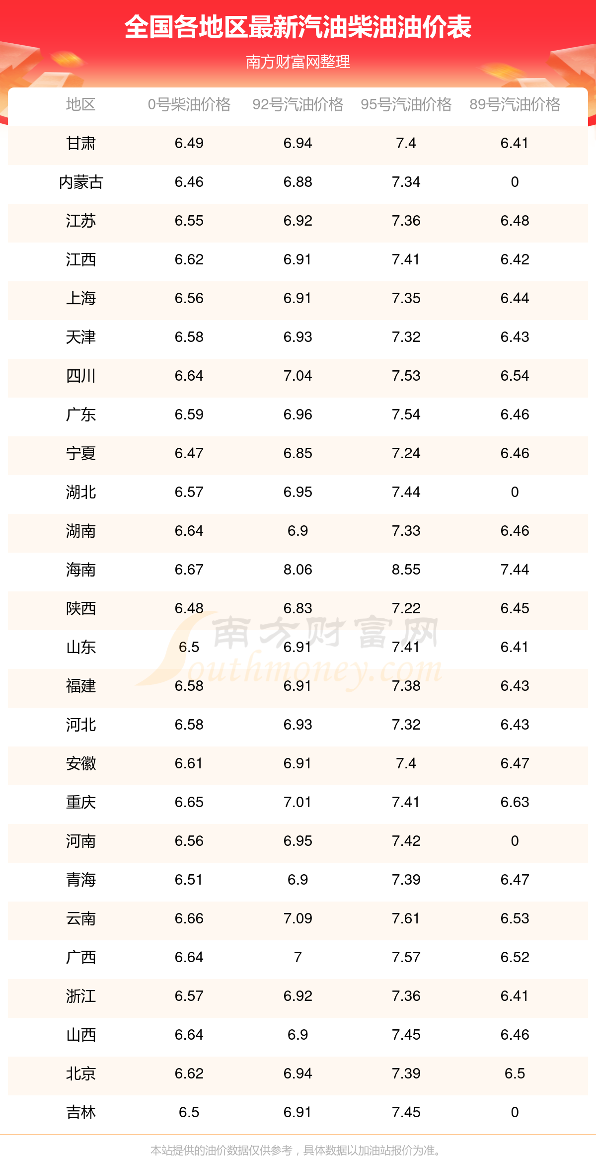 全国各地区2025年最新汽油价格表