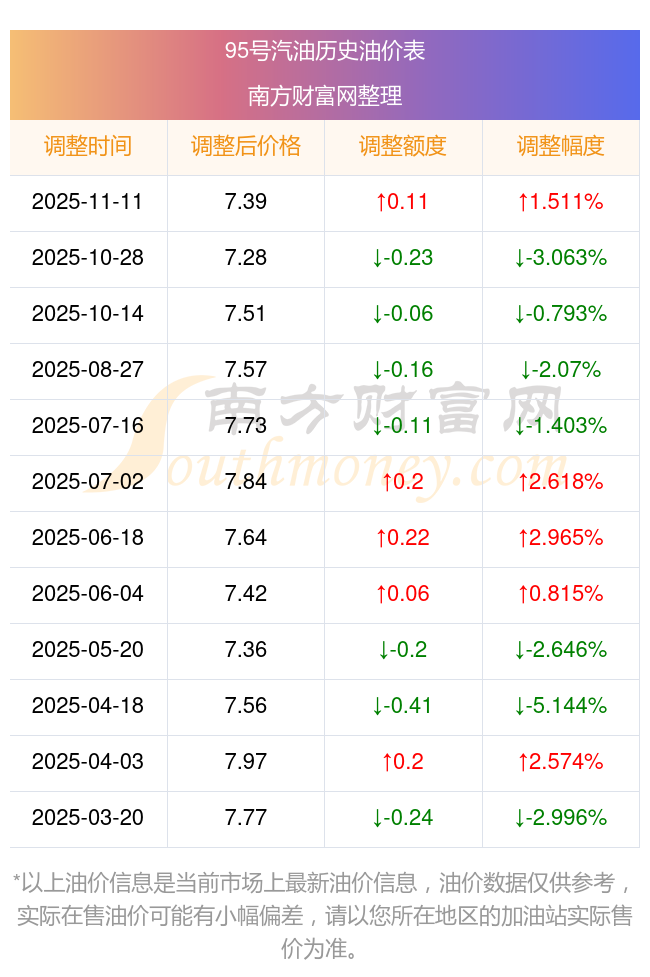 11月21日汽油价格详情:92号汽油6.94元;95号汽油7.39元;89号汽油6.5元;0号柴油6.62元(该价格为11月11日调整后的价格)。下一轮油价调整时间11月24日24时,距离现在还有3.61天。