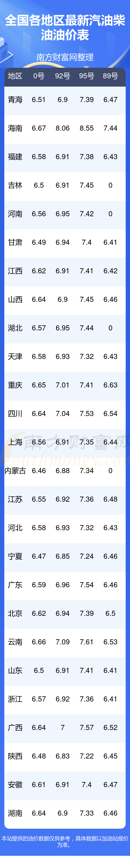 油价数据仅供参考,请以您所在地区的各加油站报价为准。