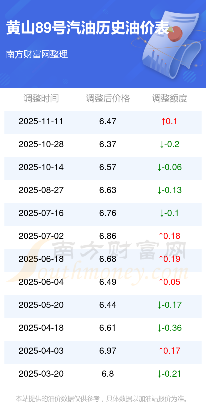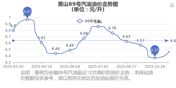 11月21日黄山89号汽油的价格是6.47元/升,油价于11月11日调整,相对上次调整时间10月28日的油价6.37元每升,共涨了0.1元,涨幅达1.57%。