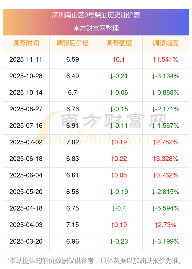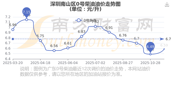 11月21日,深圳南山区0号柴油价格为每升6.59元,这是11月11日油价调整后的价格,相对上次调整时间10月28日的油价6.49元每升,上升了0.1元,上升1.541%。