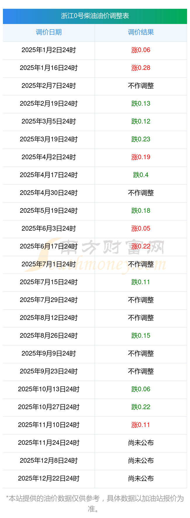 11月22日,浙江0号柴油的这些价格为6.57元每升,调整时间为11月11日,相对上次调整增了0.11元,增1.703%。