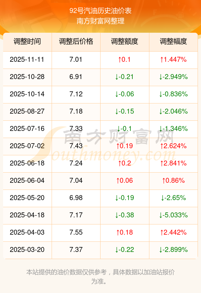 汽油价格调整最新消息:下一轮油价调整时间11月24日24时。11月22日重庆汽油、柴油的最新价格是11月11日调整后的价格,具体为92号汽油7.01元,上调了0.1元,上调幅达1.45%;95号汽油7.41元,上调了0.11元,上调幅达1.51%;89号汽油6.63元,上调了0.09元,上调幅达1.38%;0号柴油6.65元,上调了0.1元,上调幅达1.53%。