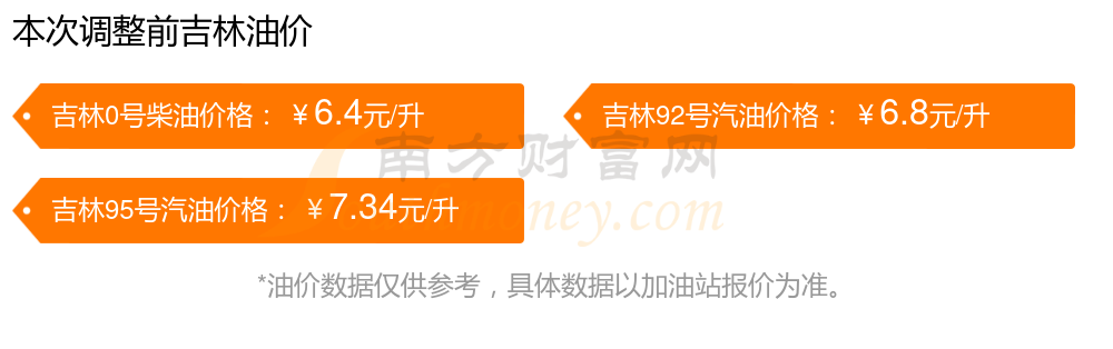 11月22日吉林汽油、柴油每升的最新价格:92号汽油6.91元,上涨了0.11元;95号汽油7.45元,上涨了0.11元;0号柴油为6.5元,上涨了0.1元,本次油价调整时间是11月11日。