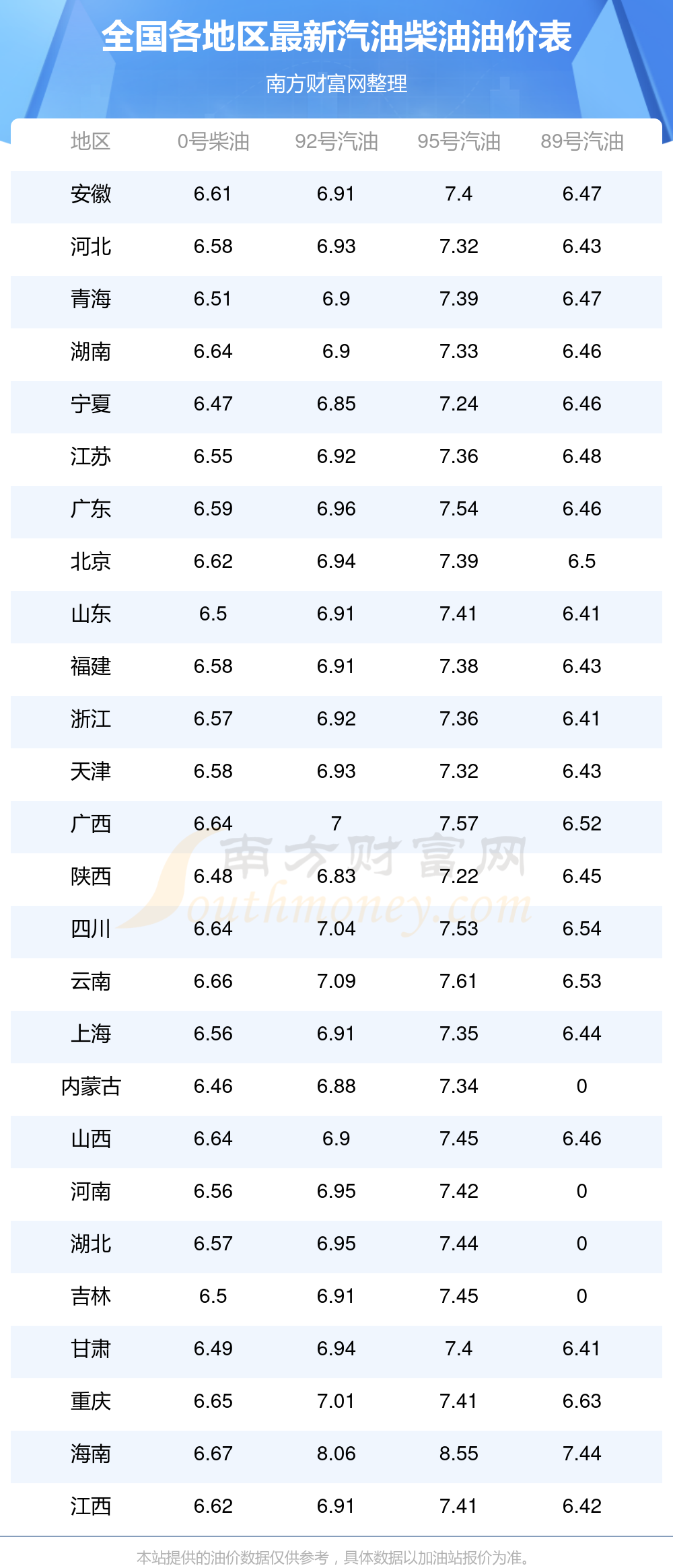 本站提供的油价数据仅供参考,具体数据以加油站报价为准。