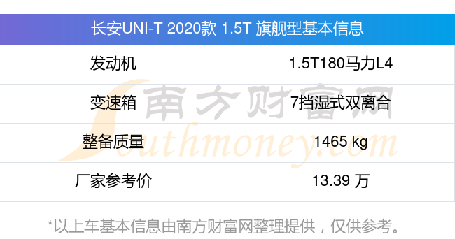 长安UNI-T 2020款 1.5T 旗舰型动力上搭载的是一台1.5T180马力L4涡轮增压发动机,匹配7挡湿式双离合自动档变速箱,燃料形式为汽油,常规整备质量1465kg,厂家参考价13.39万元。