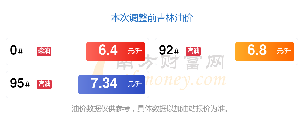 11月22日,吉林92号汽油的价格是6.91元每升,本次的调整时间为11月11日,对比上次的调整上调了0.11元,上调1.618%,11月24日24时为下一轮油价调整时间,还有2.76天。