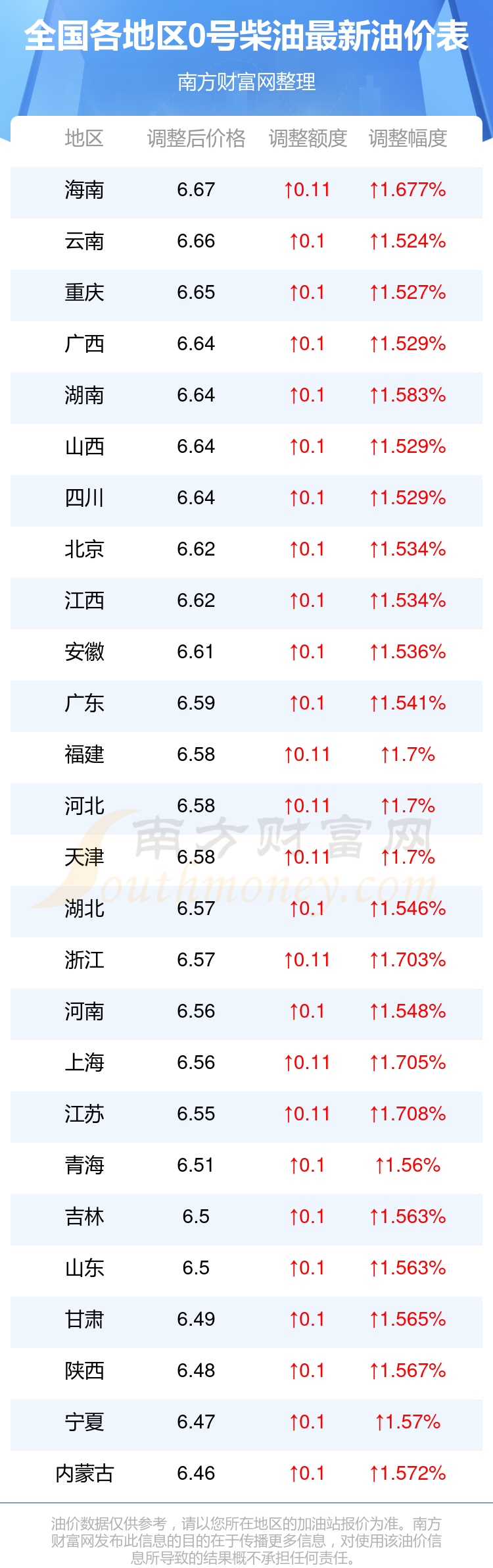 以上油价信息是当前市场上最新油价信息,油价数据仅供参考,实际在售油价可能有小幅偏差,请以您所在地区的加油站实际售价为准。