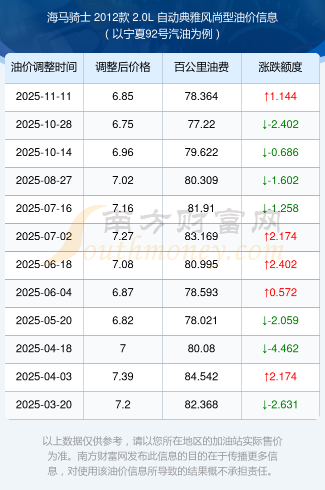 按照11月11日92号汽油最新调整价格6.85元/升来计算(以宁夏为例),该车型百公里平均油费为78.364元,按照上一轮10月28日调整价格6.75元/升来计算,百公里平均油费为77.22元,对比上一轮多花1.144元,下一轮油价调整时间为11月24日24时。