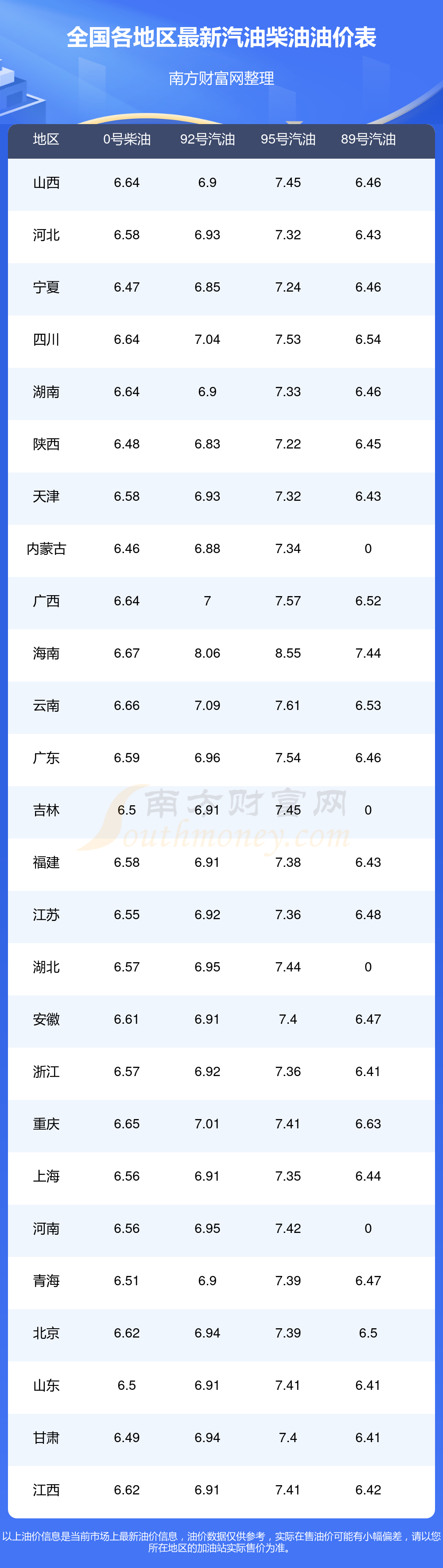 以上油价信息是当前市场上最新油价信息,油价数据仅供参考,实际在售油价可能有小幅偏差,请以您所在地区的加油站实际售价为准。