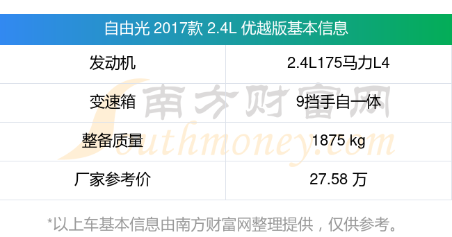 自由光 2017款 2.4L 优越版动力上搭载的是一台2.4L175马力L4自然吸气发动机,匹配9挡手自一体自动档变速箱,燃料形式为汽油,常规整备质量1875kg,厂家参考价27.58万元。