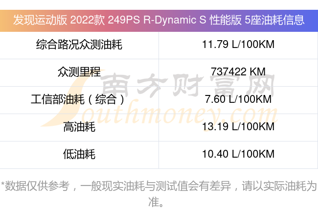 根据多位车主实测得出数据,该车型低油耗为10.40升每百公里,高油耗为13.19升每百公里,综合路况众测油耗为11.79升每百公里,工信部综合油耗为7.60升每百公里。