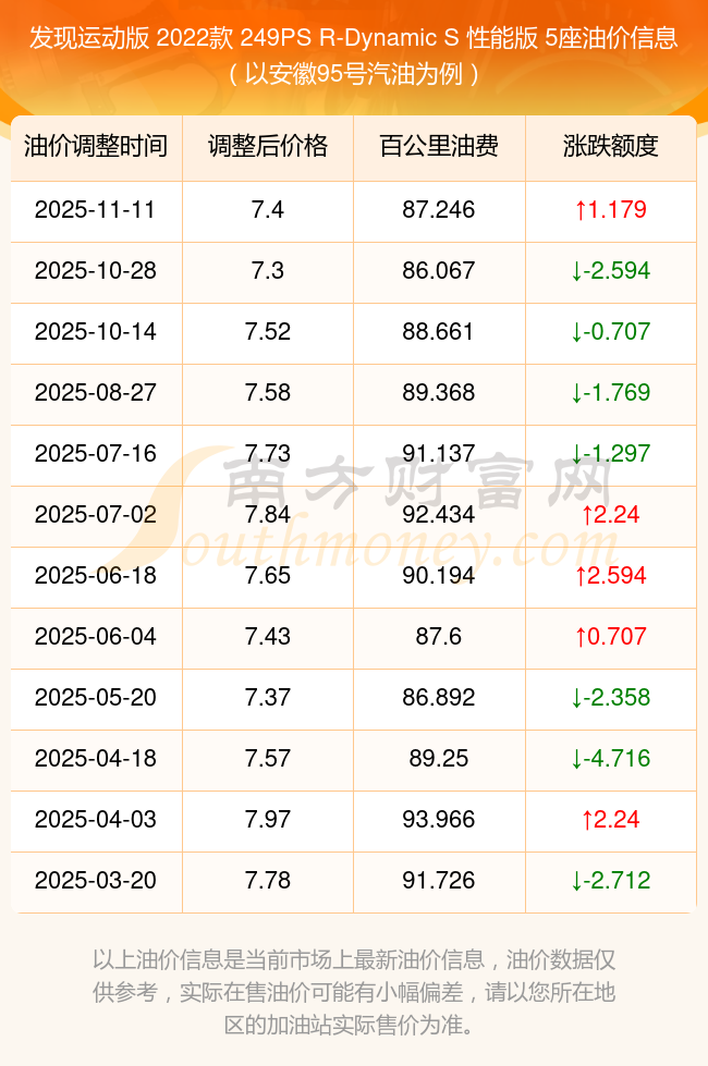 根据11月11日95号汽油最新调整价格7.4元/升来计算(以安徽为例),该车型每百公里的平均油费是87.246元,上一轮10月28日调整价格7.3元每升来计算,每百公里的平均油费是86.067元,对比上一轮多花1.179元,下一轮的油价调整时间是11月24日24时。