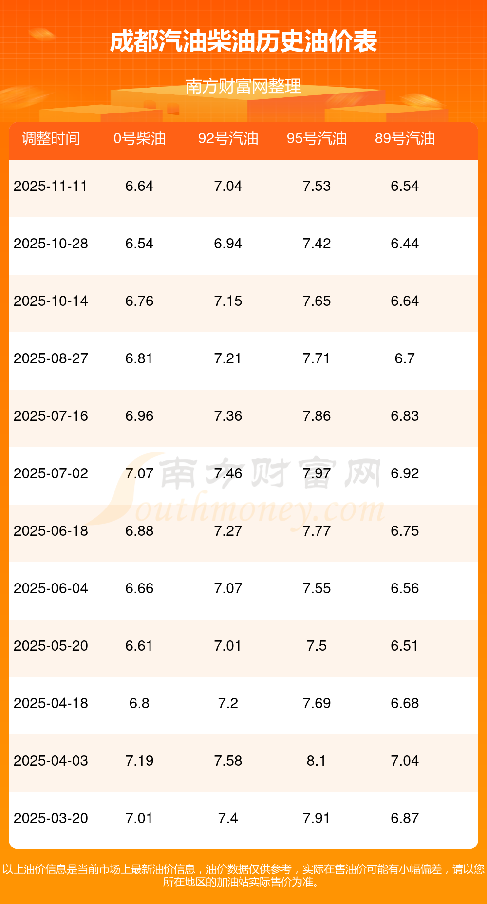 成都汽油、柴油11月22日价格多少钱一升?具体为:0号柴油为6.64元,上调了0.1元;95号汽油为7.53元;92号汽油为7.04元;89号汽油为6.54元,调整时间为11月11日。