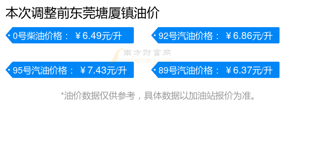 11月22日东莞塘厦镇汽油、柴油每升价格详情为:92号汽油为6.96元,上涨了0.1元;95号汽油为7.54元,上涨了0.11元;89号汽油为6.46元,上涨了0.09元;0号柴油为6.59元,上涨了0.1元,本次油价调整时间为11月11日。