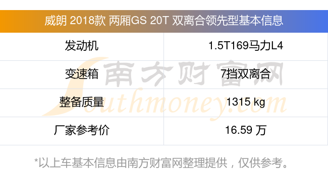 威朗 2018款 两厢GS 20T 双离合领先型搭载了一台1.5T169马力L4涡轮增压发动机,采用7挡双离合自动档变速箱,常规整备质量1315kg,厂家参考价16.59万元。