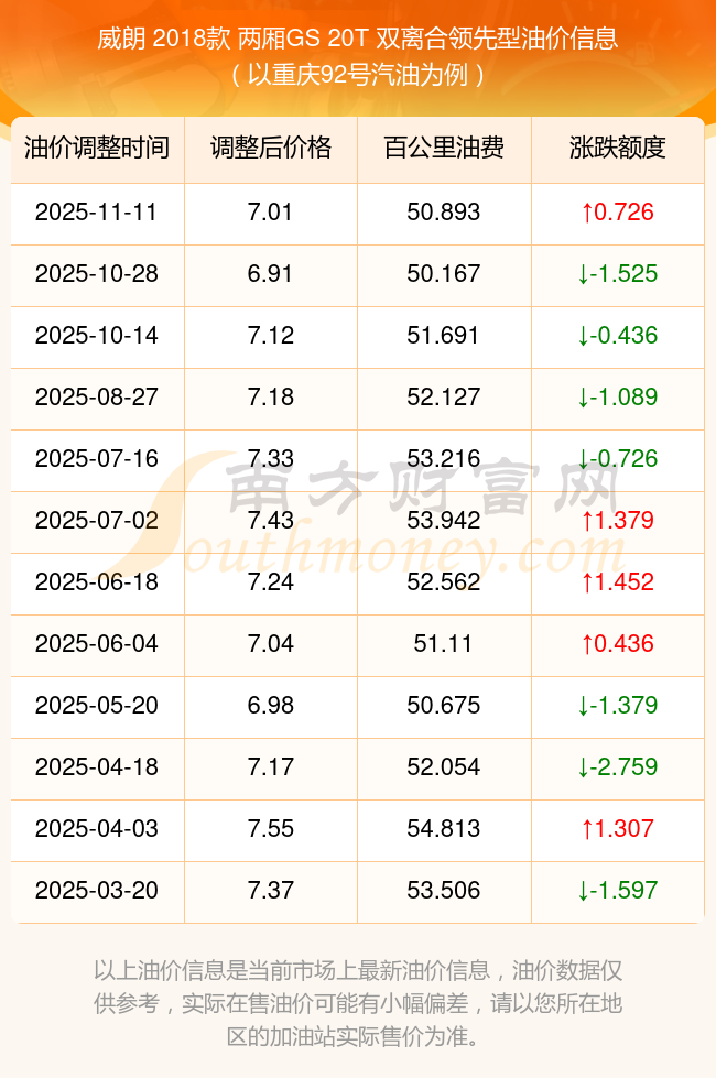 按照11月11日92号汽油最新调整价格7.01元/升来计算(以重庆为例),该车型百公里平均油费为50.893元,按照上一轮10月28日调整价格6.91元/升来计算,百公里平均油费为50.167元,对比上一轮多花0.726元,下一轮油价调整时间为11月24日24时。