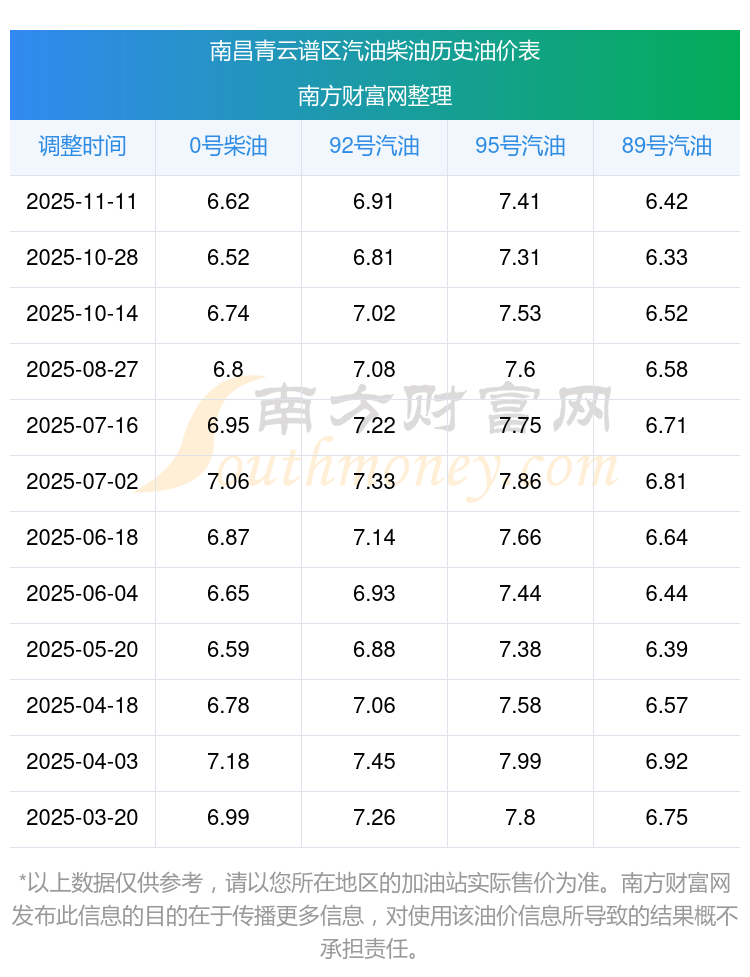 南昌青云谱区汽油、柴油11月22日价格多少钱一升?具体为:0号柴油为6.62元,增了0.1元;95号汽油为7.41元;92号汽油为6.91元;89号汽油为6.42元,调整时间为11月11日。
