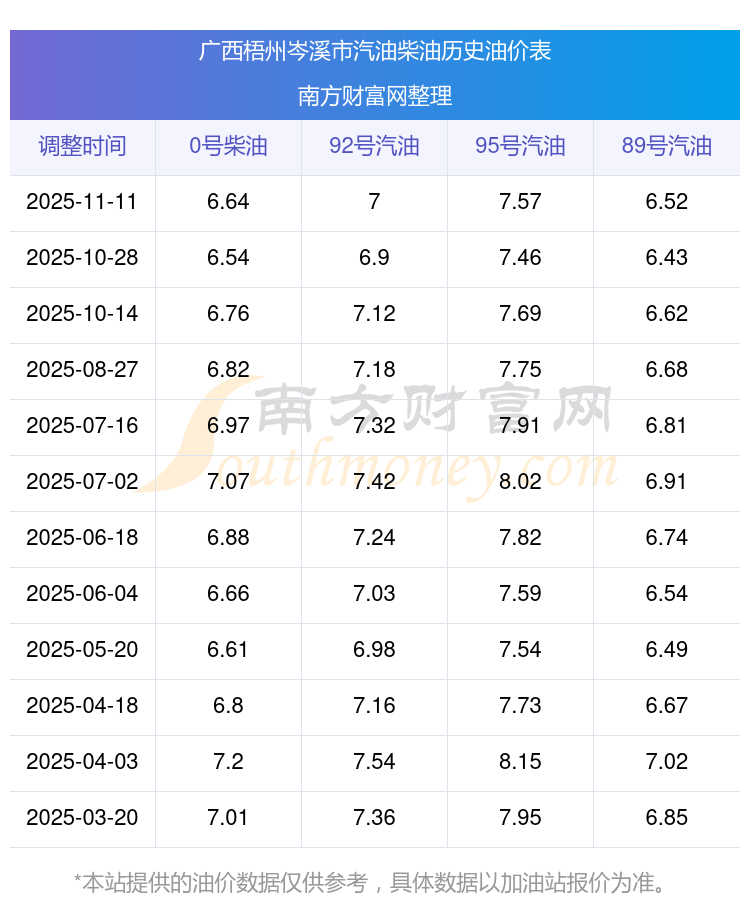 11月22日的广西梧州岑溪市汽油、柴油每升最新价格(调整时间为11月11日):92号汽油为7元,上升了0.1元,上升幅达1.45%;95号汽油为7.57元,上升了0.11元,上升幅达1.48%;89号汽油为6.52元,上升了0.09元,上升幅达1.4%;0号柴油为6.64元,上升了0.1元,上升幅达1.53%。