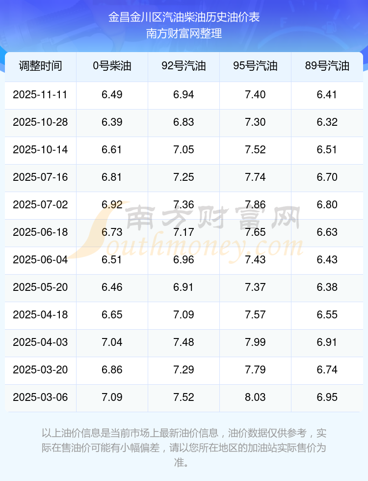 金昌金川区汽油、柴油11月22日每升的价格为11月11日调整后的价格,具体油价为:92号汽油6.94元;95号汽油7.4元;89号汽油6.41元;0号柴油6.49元。