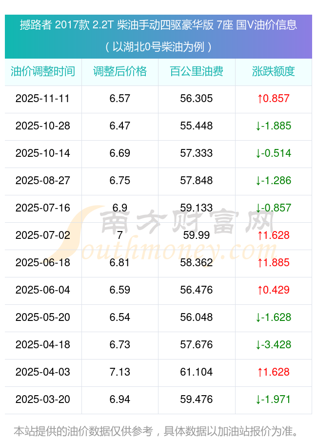 依照11月11日0号柴油最新调整价格6.57元/升来计算(以湖北为例),该车型百公里的平均油费是56.305元,依照上一轮10月28日调整价格6.47元/升来计算,百公里的平均油费是55.448元,对比上一轮多花0.857元,下一轮的油价调整时间11月24日24时。