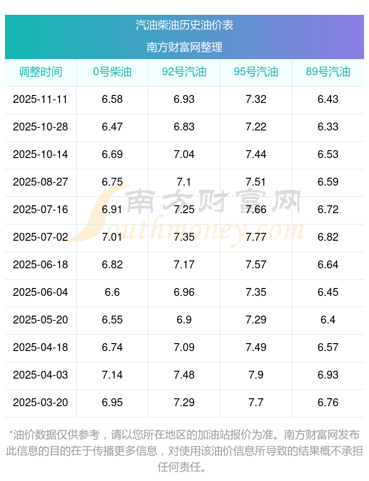 11月22日天津滨海新区95号汽油的最新价格(11月11日调整后的价格):7.32元/升,相对上次调整上调了0.1元。下一轮油价调整时间11月24日24时,距离现在还有2.64天。