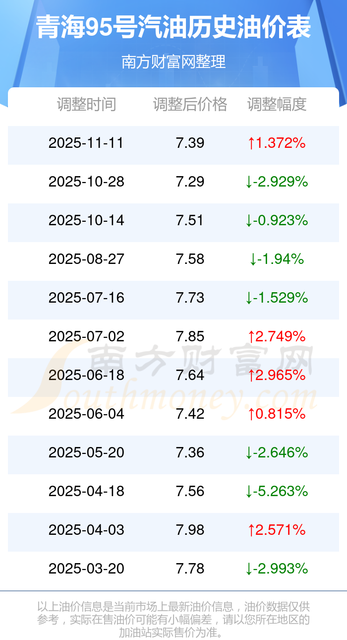 11月22日,青海95号汽油的价格是7.39元每升,本次的调整时间为11月11日,对比上次的调整上涨了0.1元,上涨1.372%,下次调整时间为11月24日24时,还有2.64天。