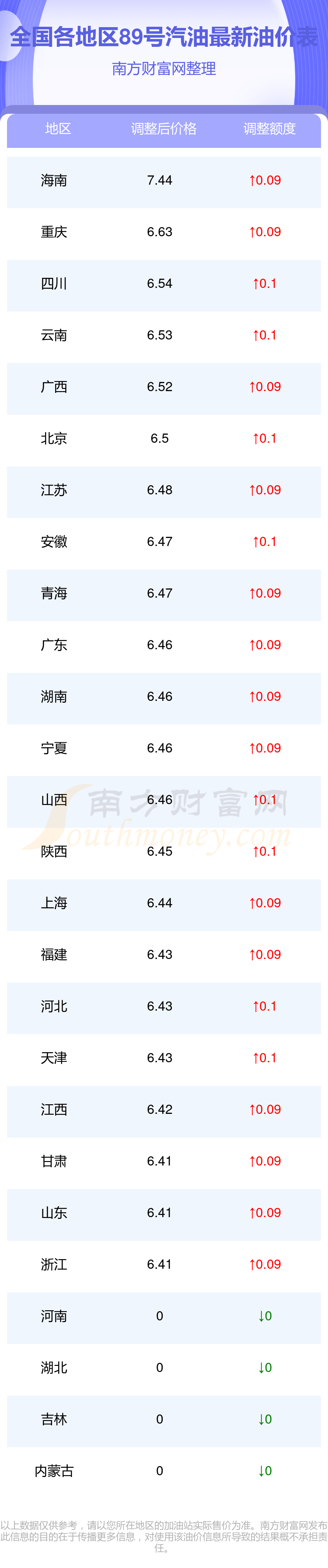 全国各地区最新89号汽油油价表