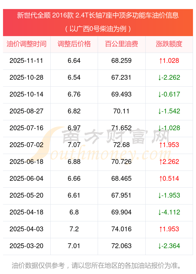 依照11月11日0号柴油最新调整价格6.64元/升来计算(以广西为例),该车型百公里的平均油费是68.259元,依照上一轮10月28日调整价格6.54元/升来计算,百公里的平均油费是67.231元,对比上一轮多花1.028元,下一轮的油价调整时间11月24日24时。