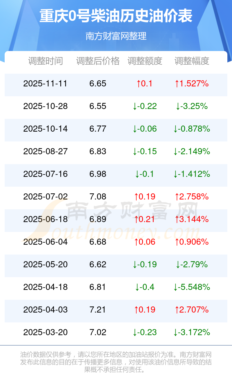 11月22日,重庆0号柴油的这些价格为6.65元每升,调整时间为11月11日,相对上次调整上涨了0.1元,上涨1.527%。